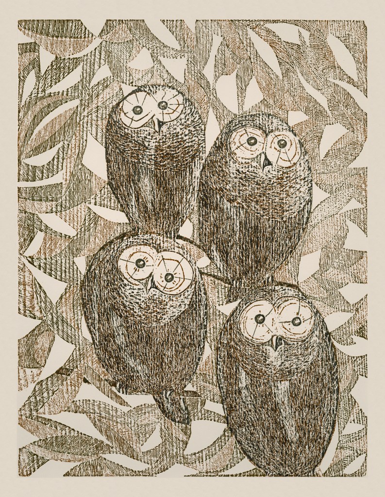 Barred Owls 1974 – Wood Block print – two colours 27.5 cm x 35.5cm (approx.) A total of nineteen prints, signed and numbered by the artist, are in existence.