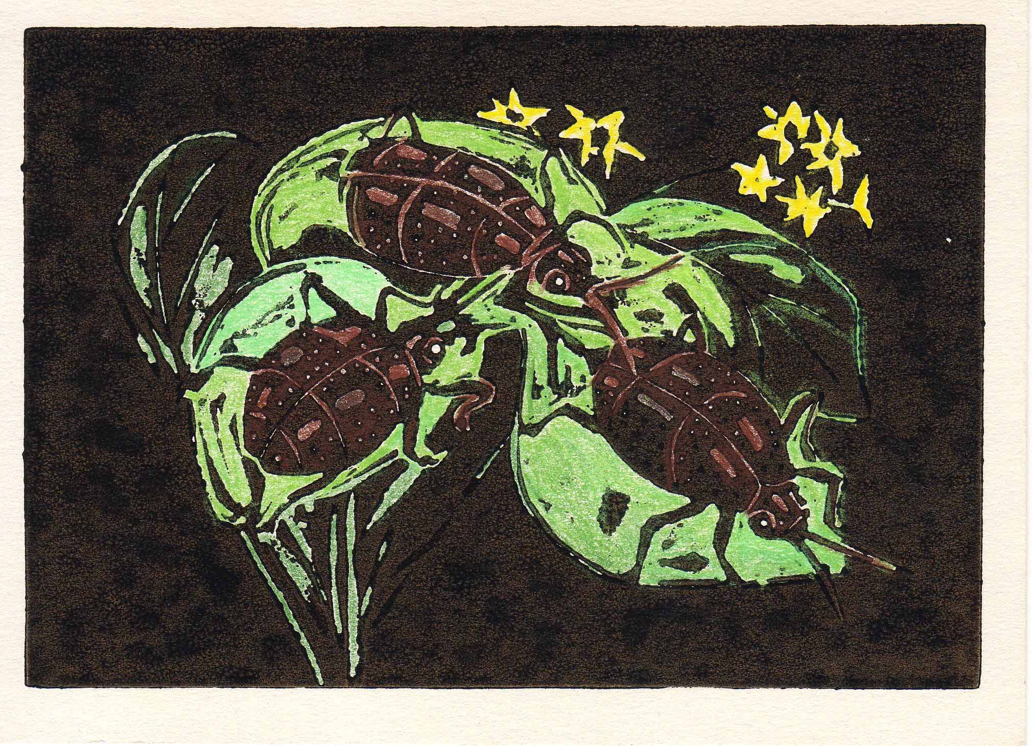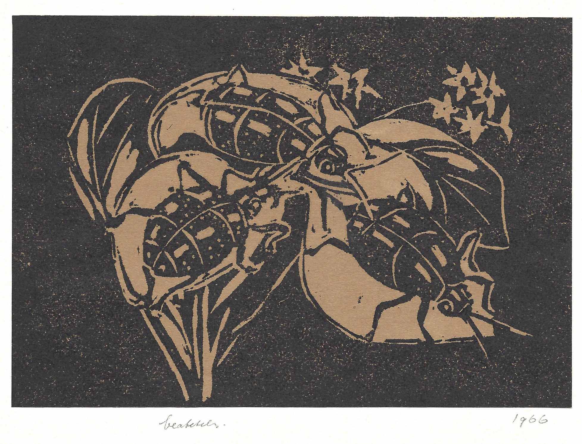 Beetles; Print of lino block on coloured paper (two versions), 1965.