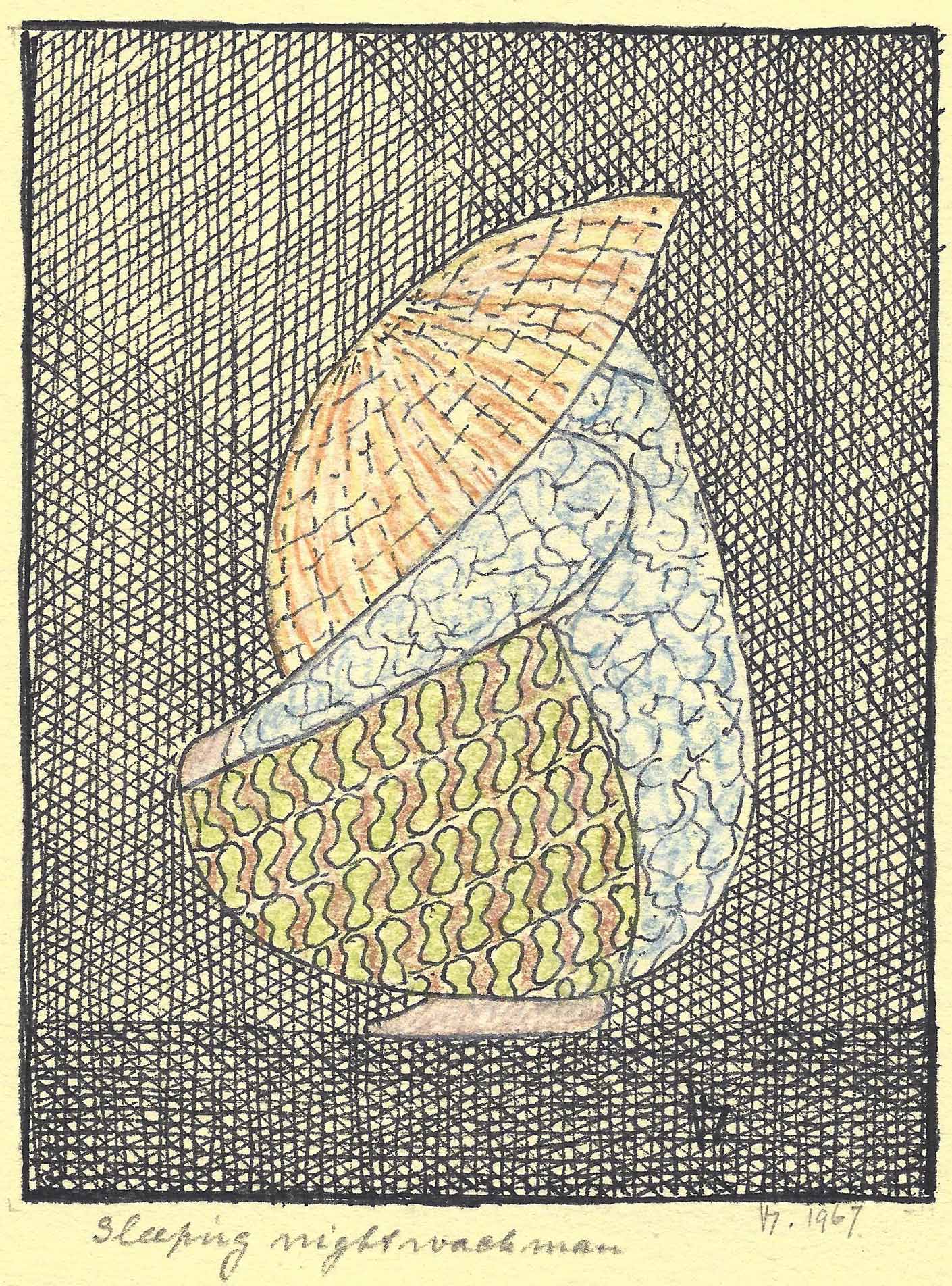 Sleeping Night Watchman; Ballpoint pen and coloured pencil, 1967