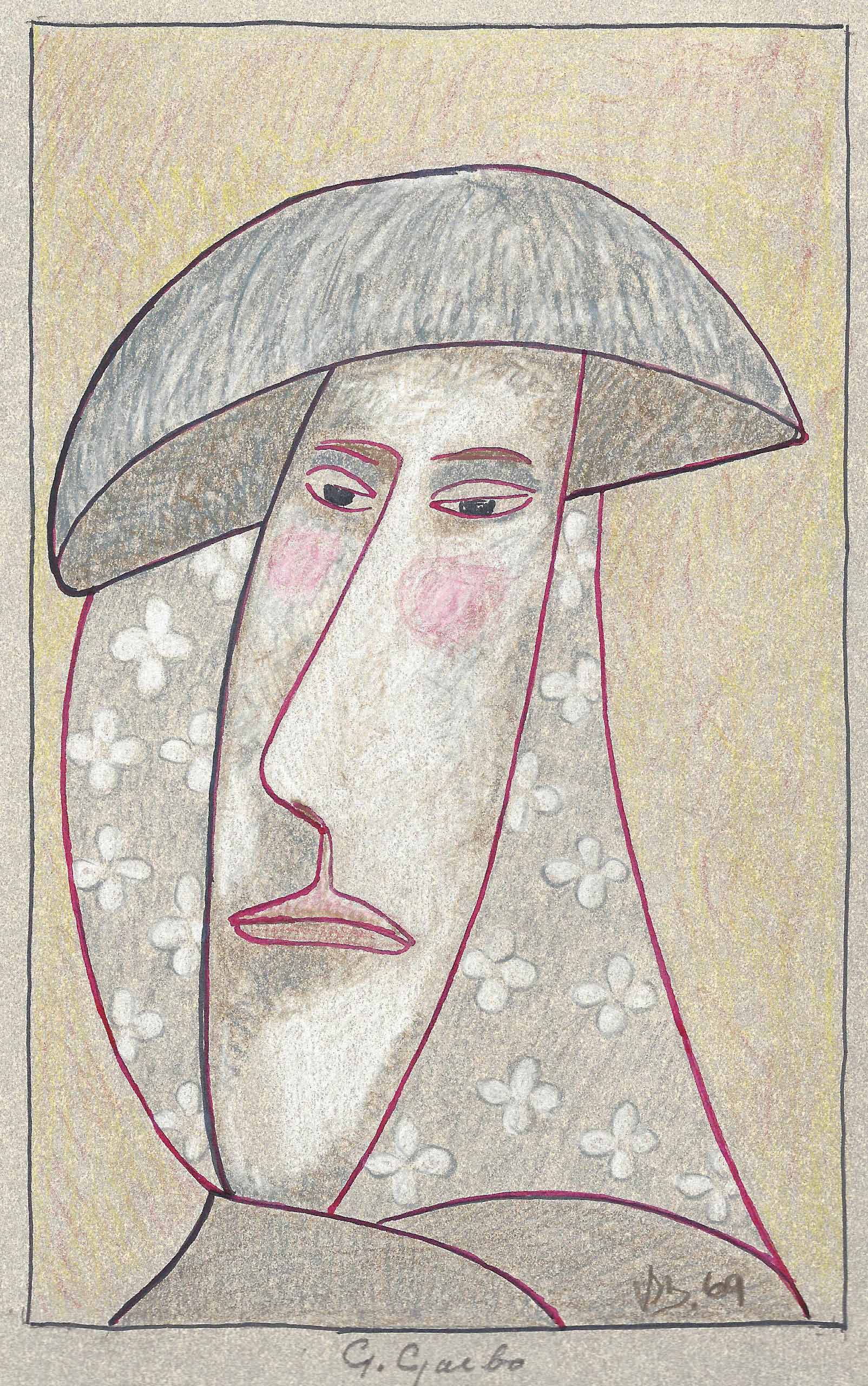 Greta Garbo; Ink and coloured pencil on board, 1969.