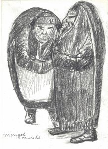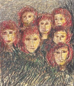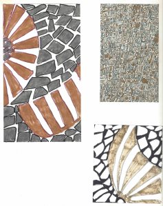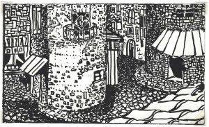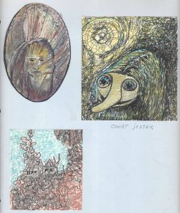 Medicine Woman; Court Jester; and Buildings; Ink and coloured pencil on paper.