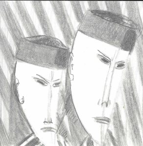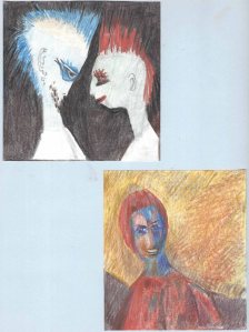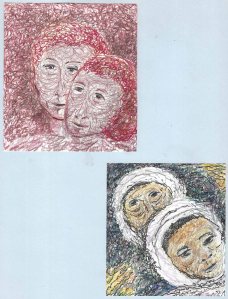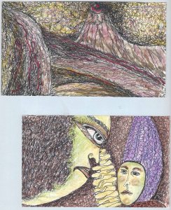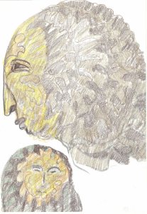 Solar Deity Mask – Two Views; Coloured pencil on paper.