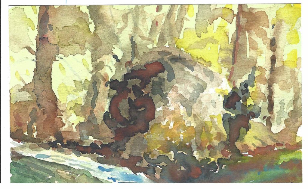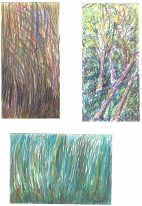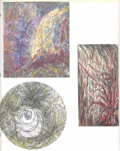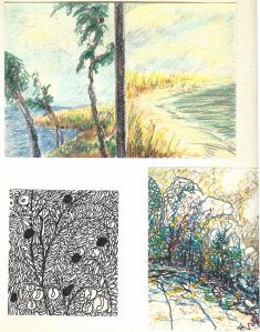 Two Shores, Coloured pencil on paper; Fruit Tree, Ink on paper; and Grove on Hill, Coloured inks and coloured pencil on paper.