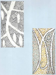 Abstract Forms 1, 2 and 3, All, felt tip pen on paper; top right enhanced with gold paint.