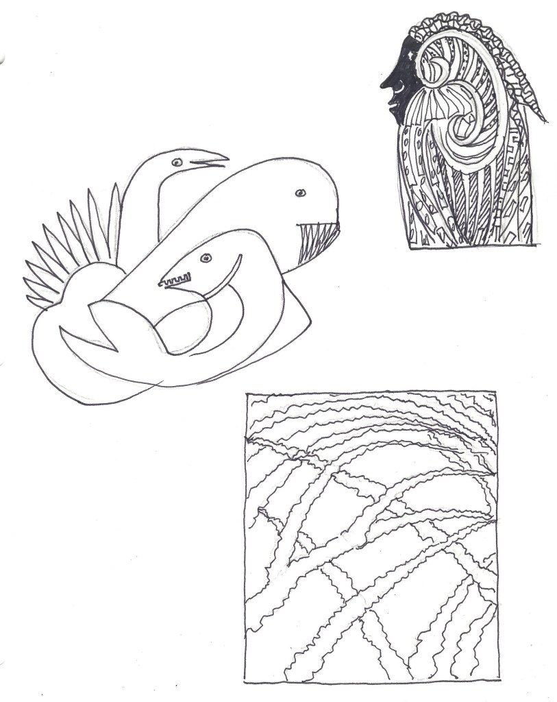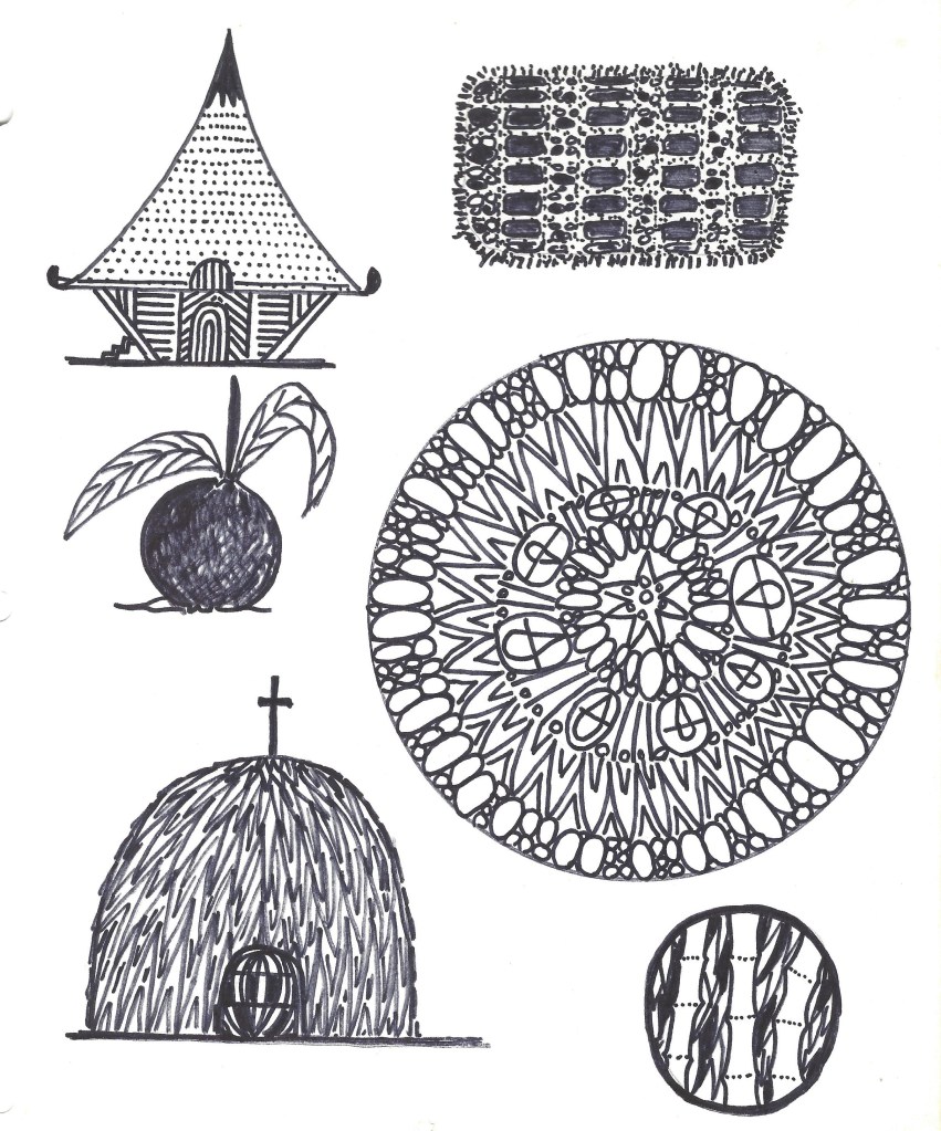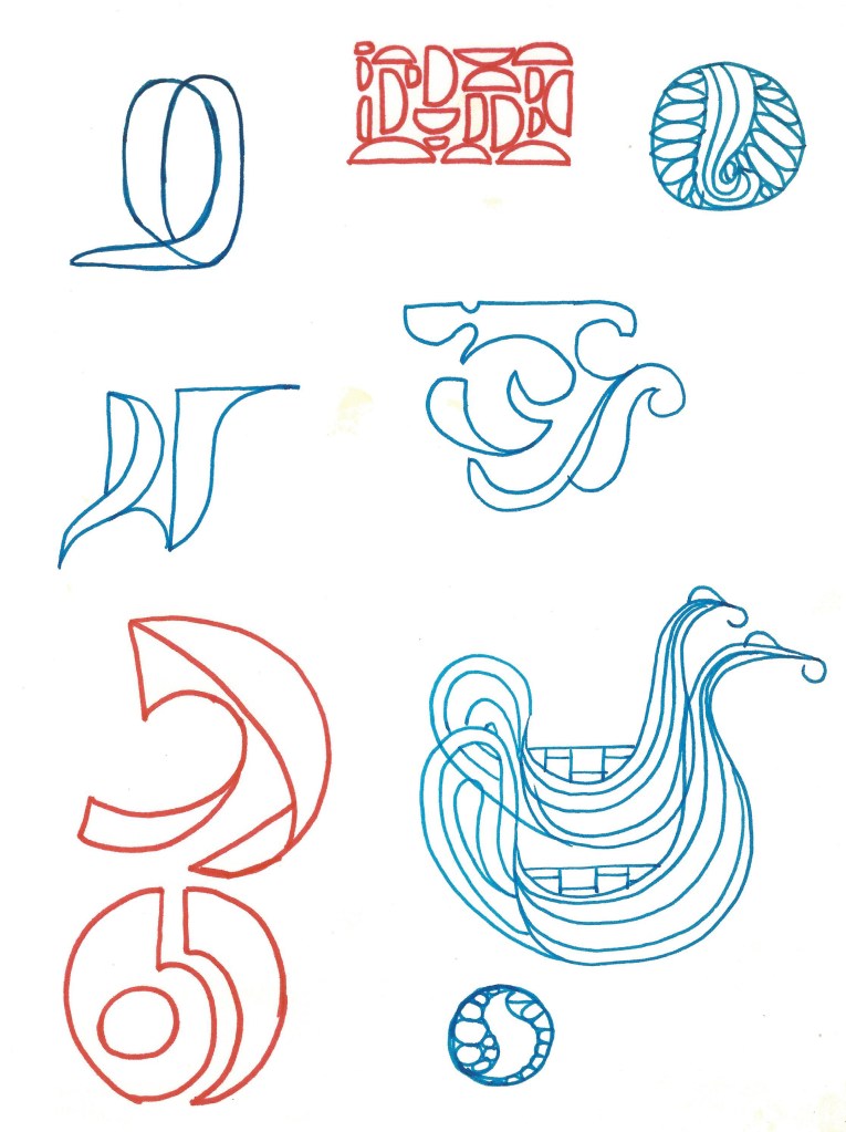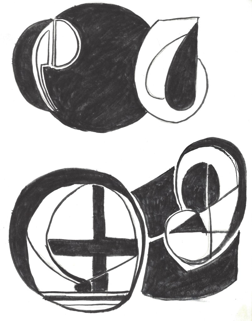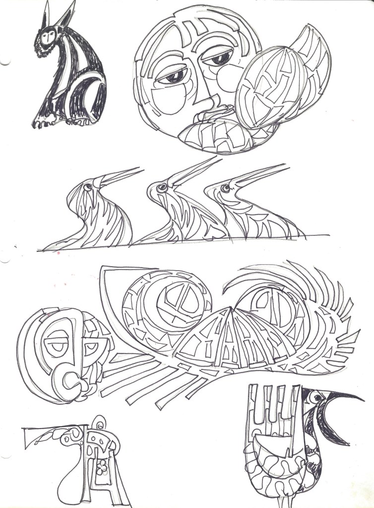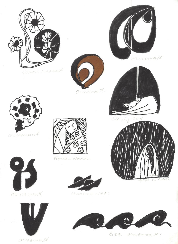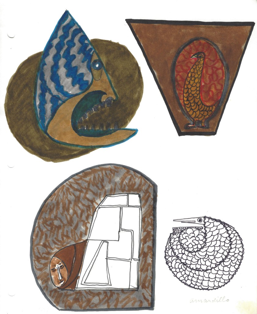 This is a loose-leaf binder. The early pages have been fully worked out on standard 8 ½” x 11” blank paper in what appears to be felt-tip pen with the occasional application of an ink wash. Later pages, not included here, are still in pencil as they were traced or, in some cases, redrawn freehand from the original sketches