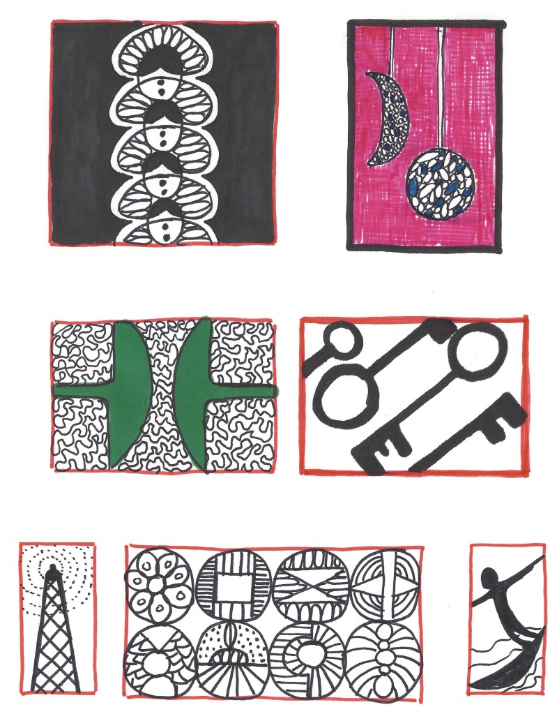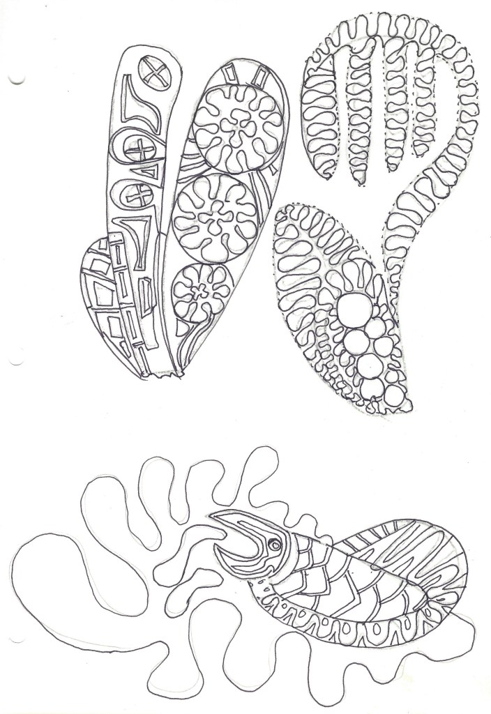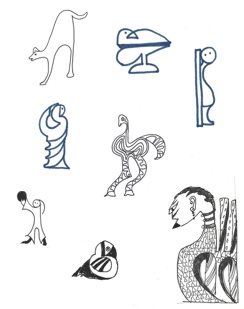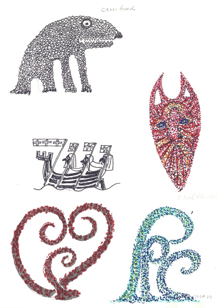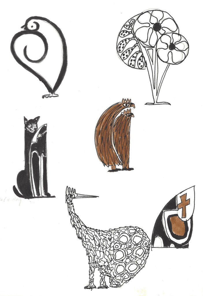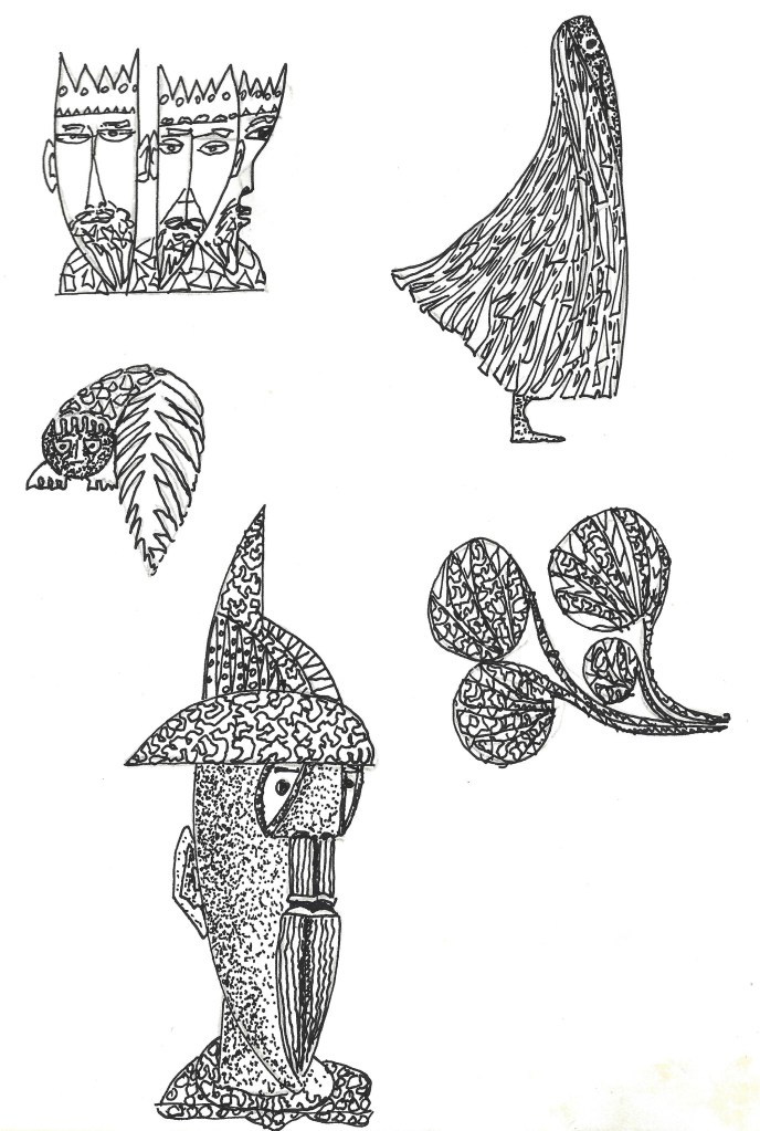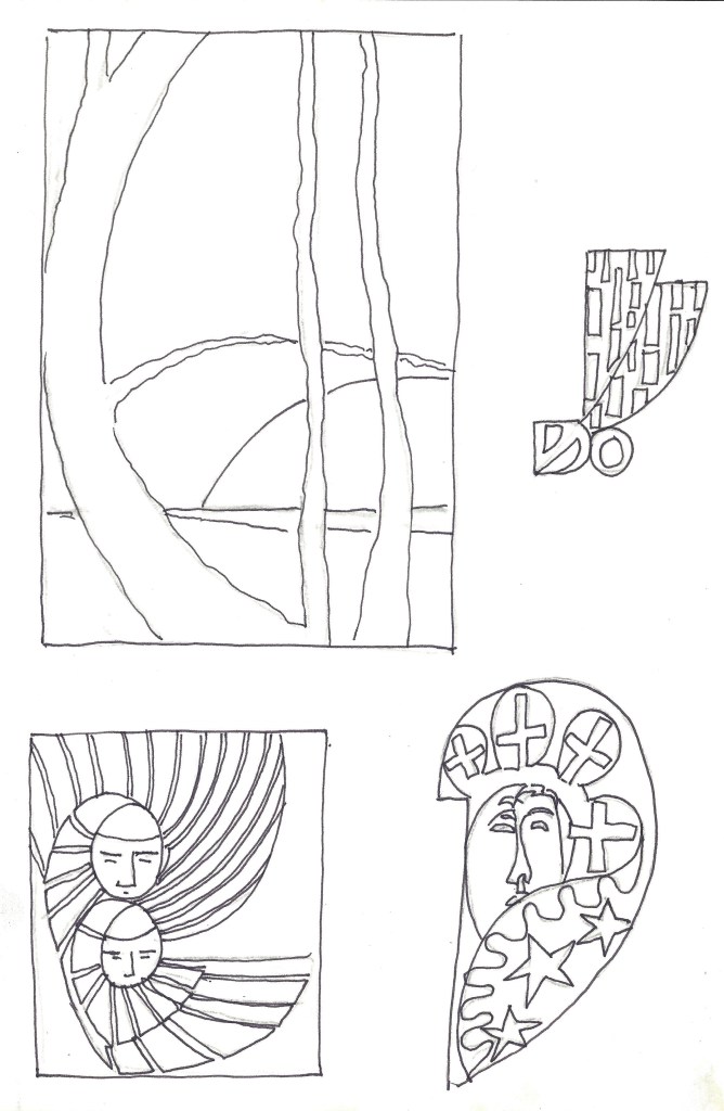 This is a loose-leaf binder. The early pages have been fully worked out on standard 8 ½” x 11” blank paper in what appears to be felt-tip pen with the occasional application of an ink wash. Later pages, not included here, are still in pencil as they were traced or, in some cases, redrawn freehand from the original sketches