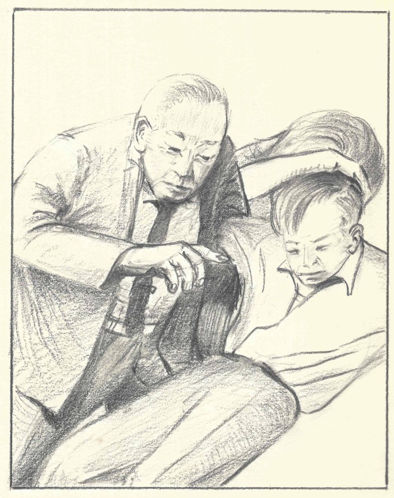 Screentone is a process for adding texture to drawings that are to be reproduced in halftone. It seems to me that there is a slight cutting error in the bottom right, but there is no indication the instructor pounced on that. The drawing was matted, an indication that Carl thought highly of it and intended to use it in his portfolio. (The Moiré effect is an artifact of digital photography. The actual tone is produced by straight vertical lines spaced sixty to the inch.)