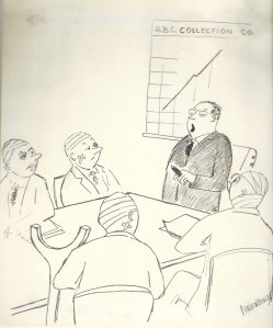 Carl submitted cartoons to magazines in the mid-1960s without success. This one almost doesn’t need a caption, although it would probably have had one in its final form, so it may not have been submitted. Although sketches were often permitted, Carl generally finished his cartoons in India ink on board before he sent out a batch. It is signed, however, which suggests a semi-final state.
